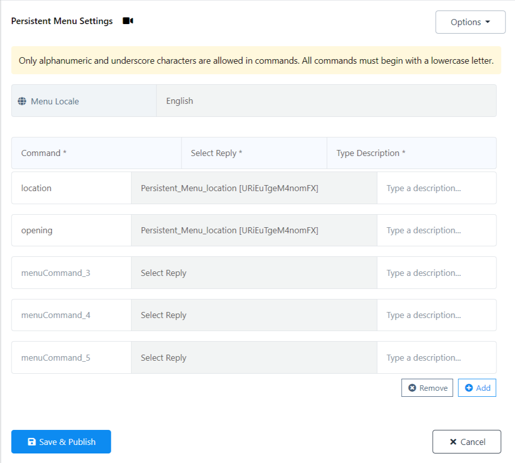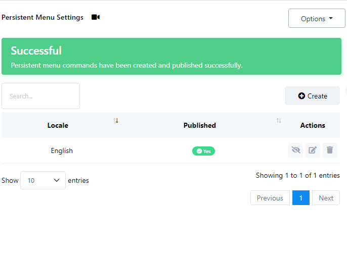 - Click the `Save and Publish` button. A success message will confirm the creation and publication of the persistent menu.