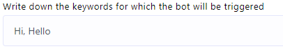 - Keyword Triggering: To initiate the bot using specific keywords,double-click on the `Start Bot Flow` element. This action will open the `Configure Reference` in the left side, featuring ten fields and two buttons. In the first field, you can input a list of comma-separated keywords. When a user enters text in the messaging window that matches any of these keywords, the bot will be triggered.