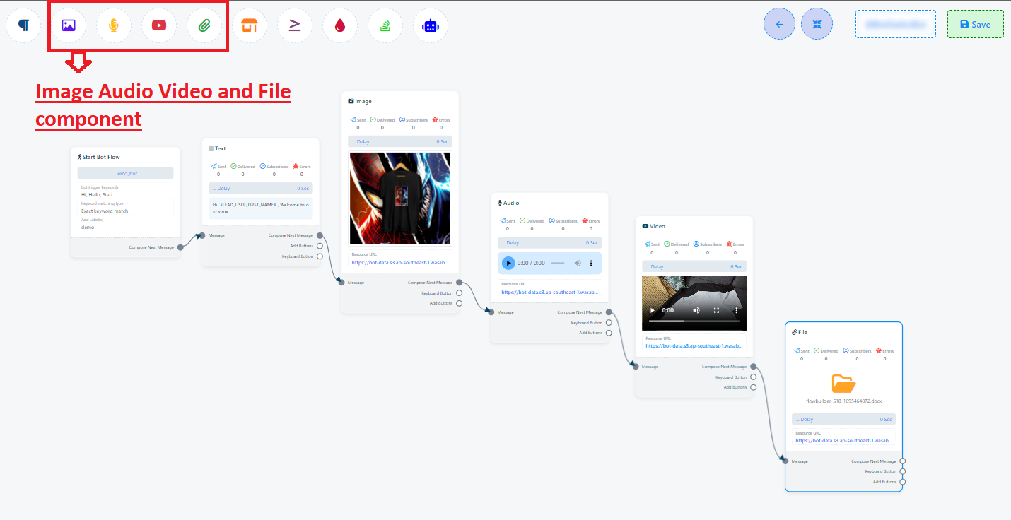 Similarly, you have the option to incorporate image, audio, video, and file components into your chatbot. To use these components, you`ll need to upload the corresponding image, audio, video, or file. Afterward, you can establish connections between these components and other elements as needed.