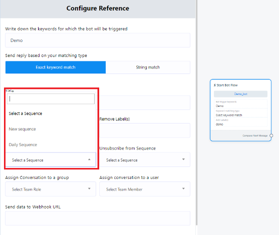 - Begin by double-clicking on the `Start Bot Flow` or any `button` component. Within the pop-up menu, you`ll find the option to `Subscribe to Sequence`. Click on this option, and select `new sequence`. Save your changes. Any sequence that have been created before can also be selected from the list.