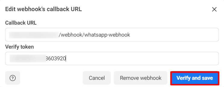Em seguida, cole a URL de retorno do Webhook e o token de verificação nos campos URL de retorno e token de verificação, respectivamente. Agora clique no botão verificar e salvar.
