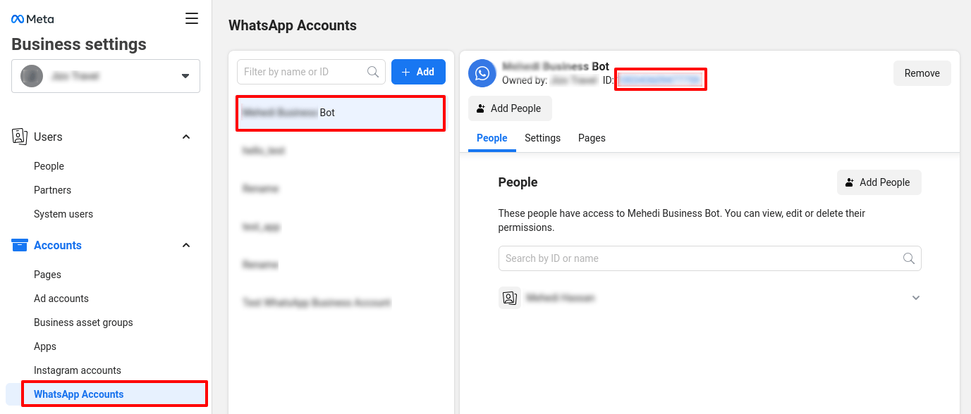 Para obter o ID da conta do WhatsApp Business, acesse a página de configurações do aplicativo. Em seguida, na barra lateral esquerda da página, selecione o menu da conta do WhatsApp. A seção Contas do WhatsApp aparecerá instantaneamente. Agora, selecione seu aplicativo e copie o ID da conta do WhatsApp Business.